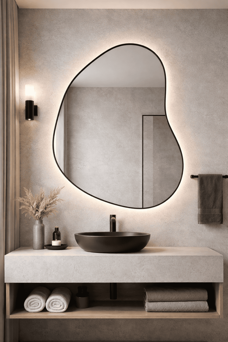 Espelho orgânico com moldura preta minimalista, perfeito para projetos contemporâneos.
