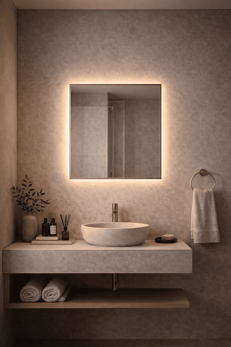Espelho compacto com iluminação LED integrada, ideal para banheiros modernos.