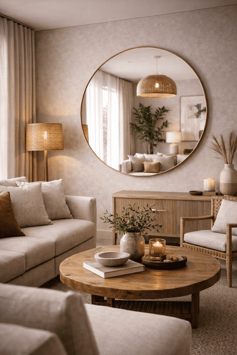 Espelho redondo clássico que amplia visualmente o ambiente.